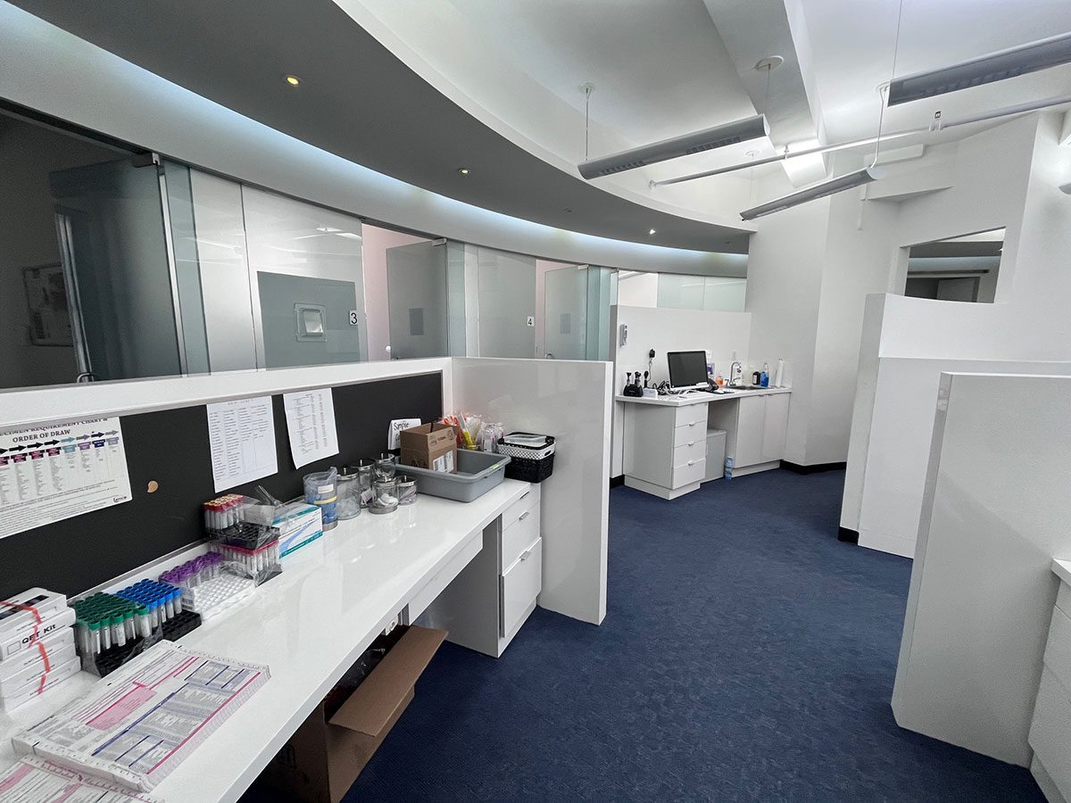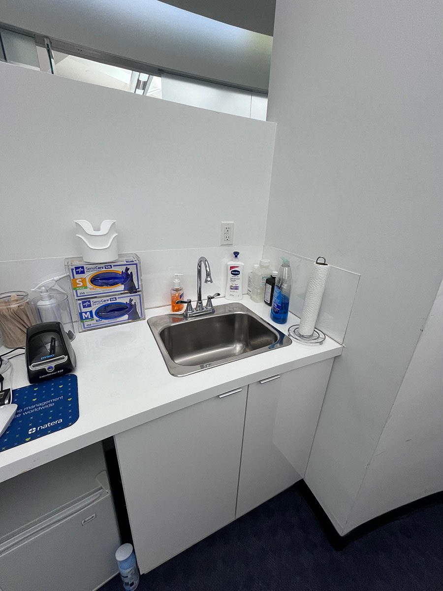 4 treatment rooms, large windowed waiting room, reception area, sink and storage within
